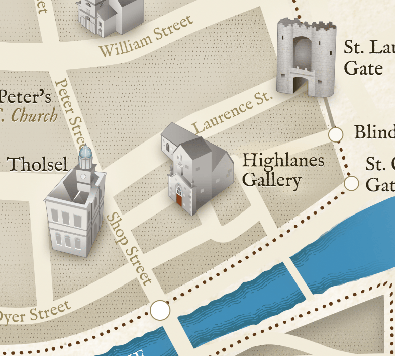 Vintage style map of historic medieval walled town of Drogheda, showing historic sites, and showing original town wall outline, gates and towers. Each historic site is illustrated in miniature, fantastic detail. Choose either a standard digital print, or a premium giclée (pronounced 'zhee-clay') art print.